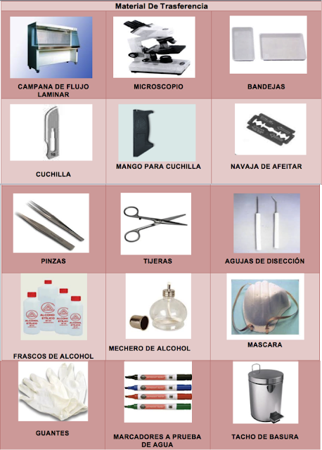 ÁREA DE TRANSFERENCIA: (SIEMBRA, INOCULACIÓN), esta área requiere de los mas altos niveles de asepsia, ya que es aquí donde se realiza el trabajo de excisión, inoculación y transferencia de los explantes a los medios de cultivo. De contar con una instalación de gabinetes de flujo horizontal o vertical de aire filtrado bajo presión, estos deben ubicarse alejados de las puertas y corrientes de aire para lograr l vida útil de los filtros.